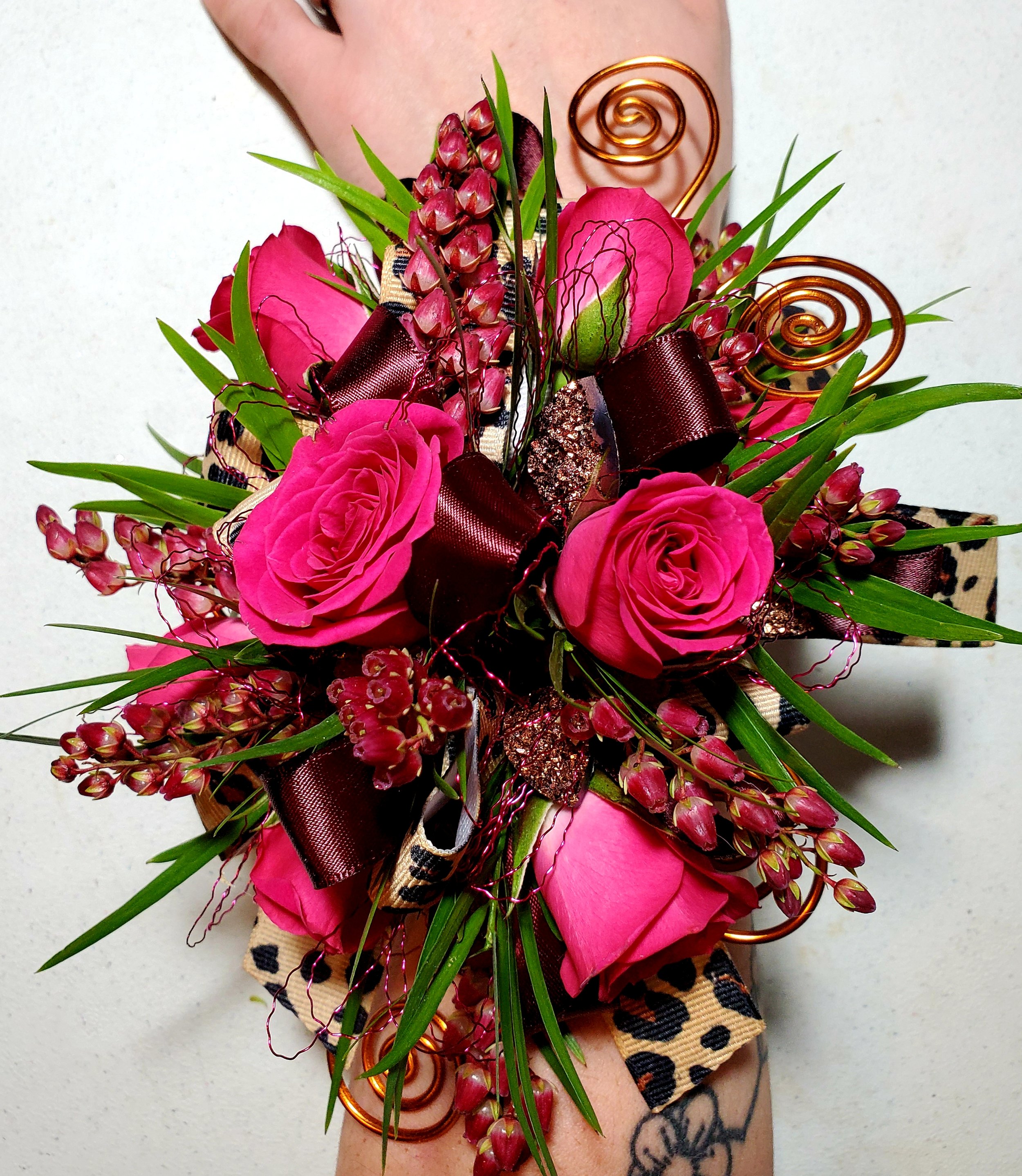 Dressier look and larger size than the junior corsage. 4-5 mini rose blooms, mixed ribbons, glitter leaf accents, foliage, filler flower on your choice of bracelet style!