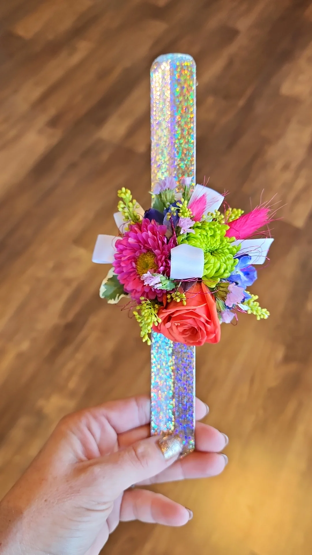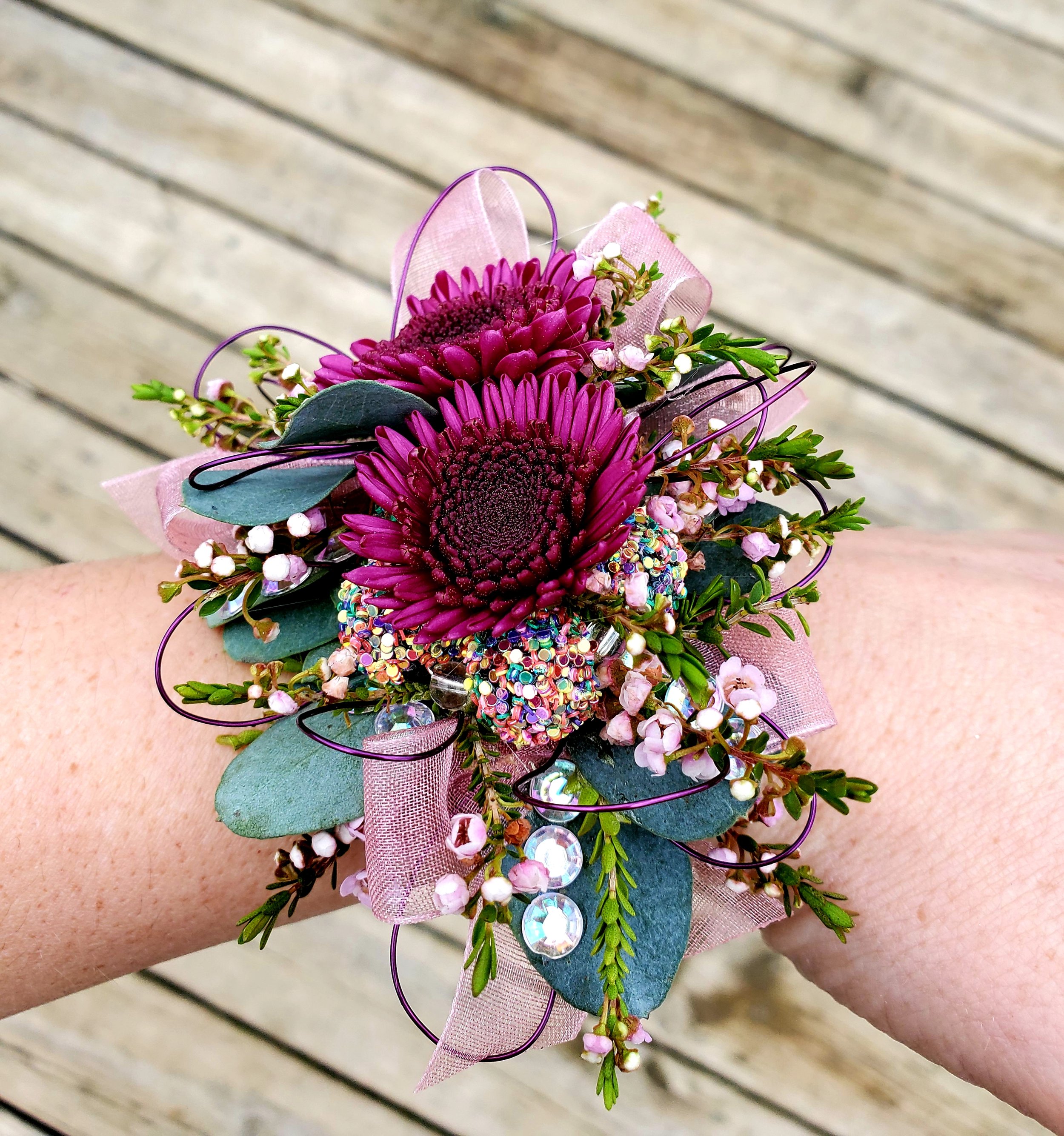 FULL GLAM style and fit for a QUEEN! 6-7 mini rose blooms, mixed ribbons, glitter leaf accents, wire and gem accents, foliage, filler flower on your choice of dressy bracelet!