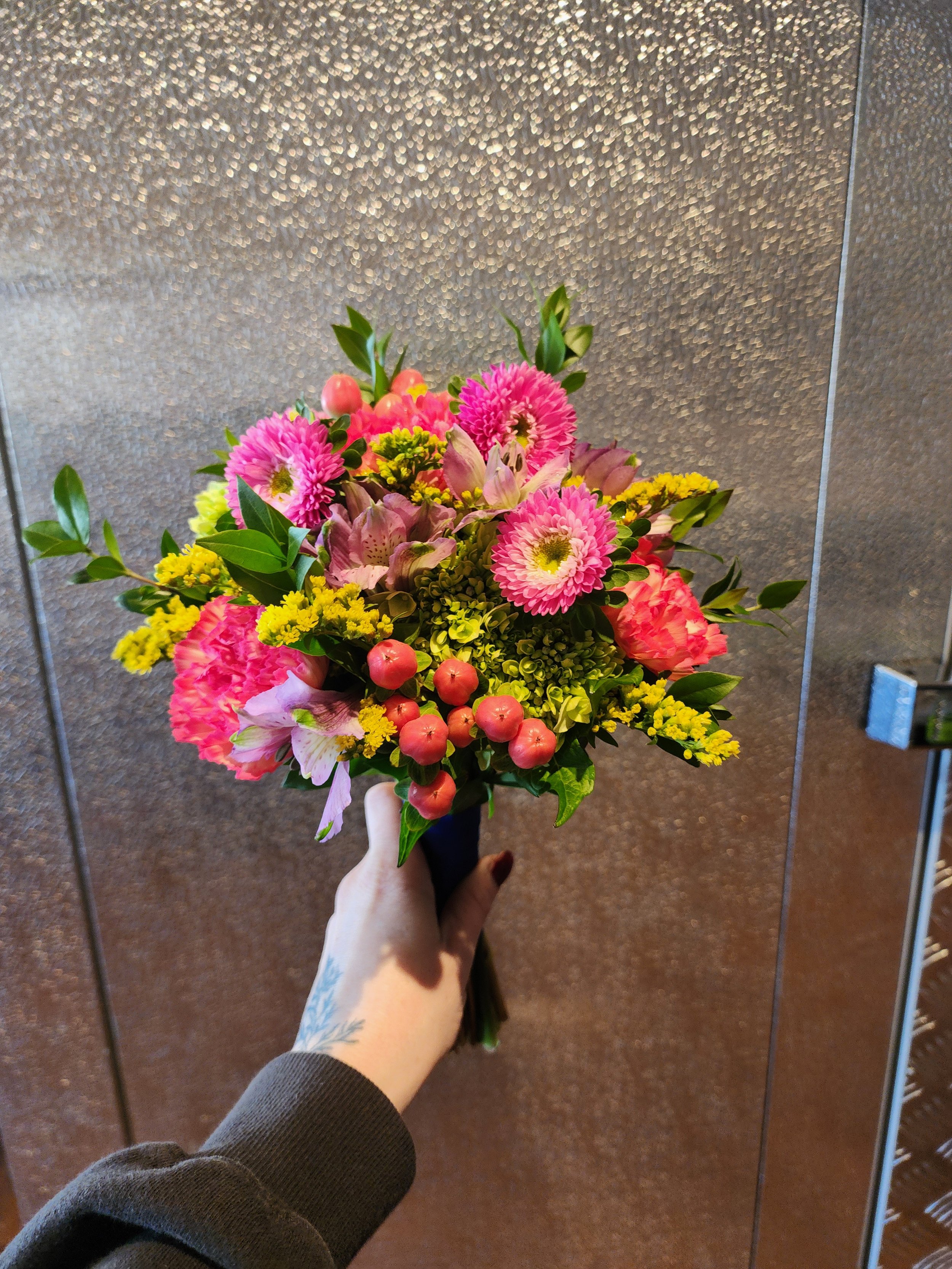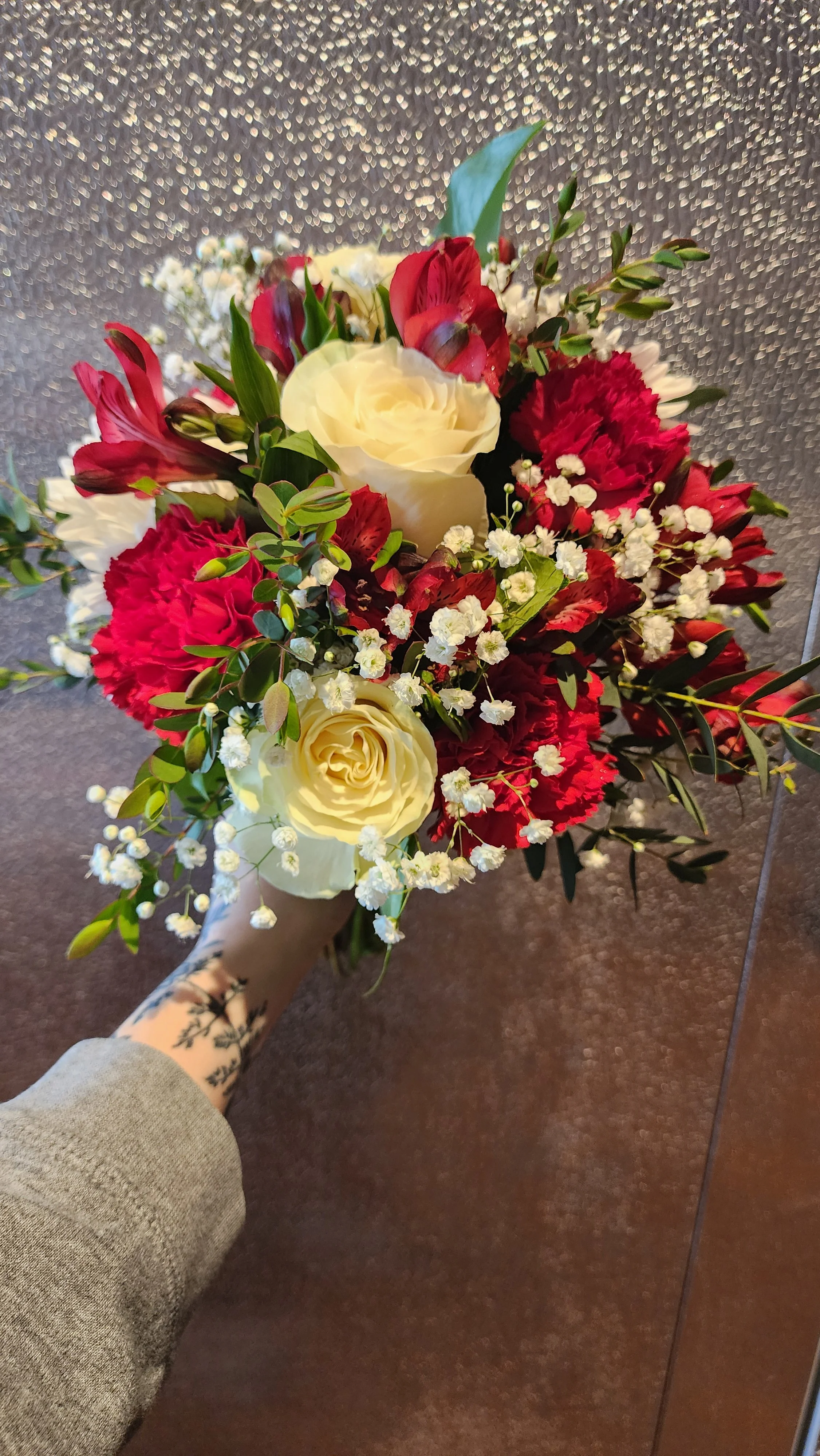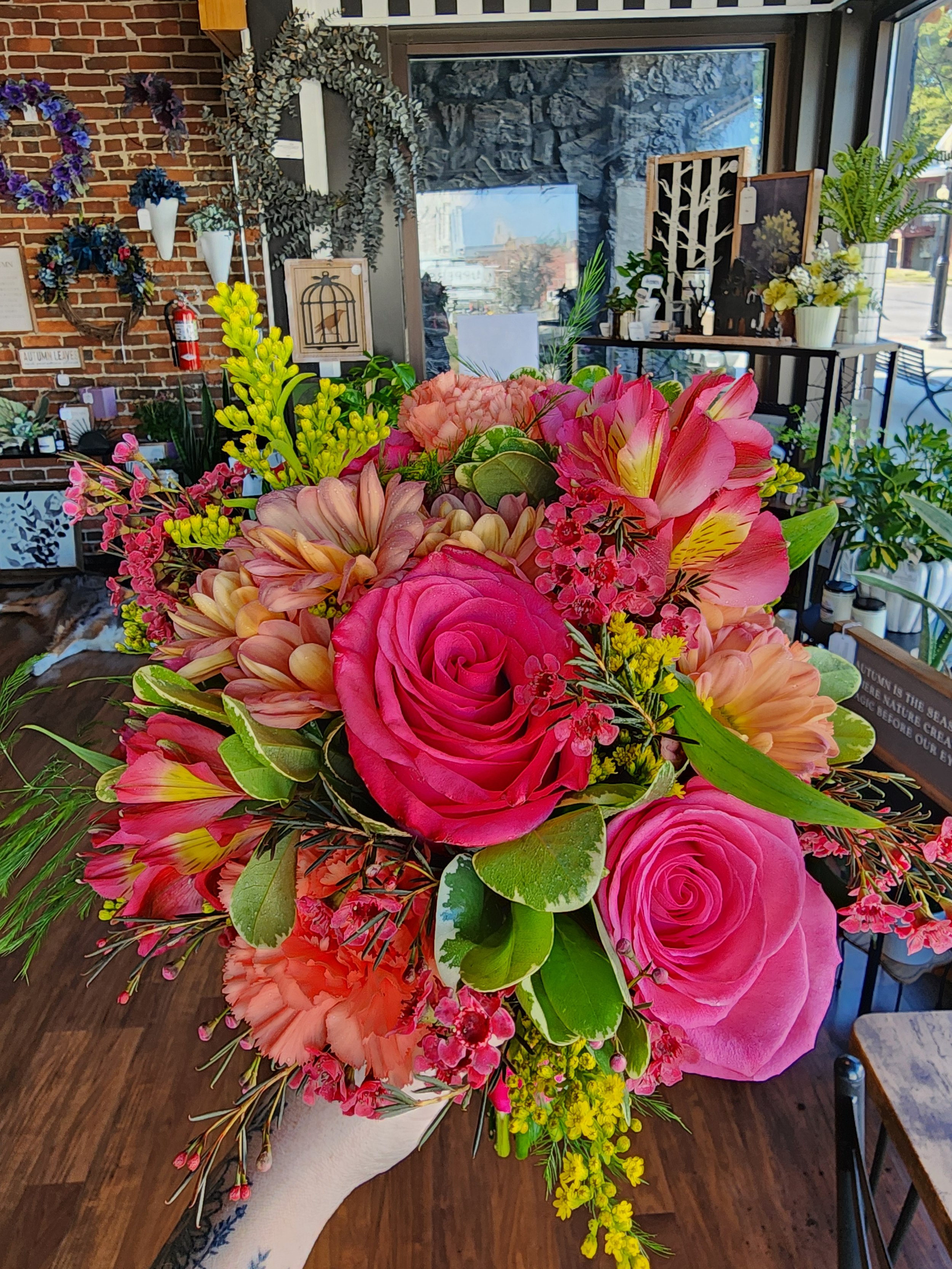 15-18 Stems of mixed flowers in your color(s) of choice, more of the nicer flowers like roses, plus foliage and filler flower, tied with ribbon and sent home in vase to preserve freshness!